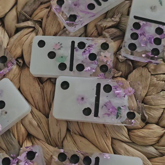 Jeu de dominos en résine. Effet violet et blanc avec fleurs. Idéal pour offrir.